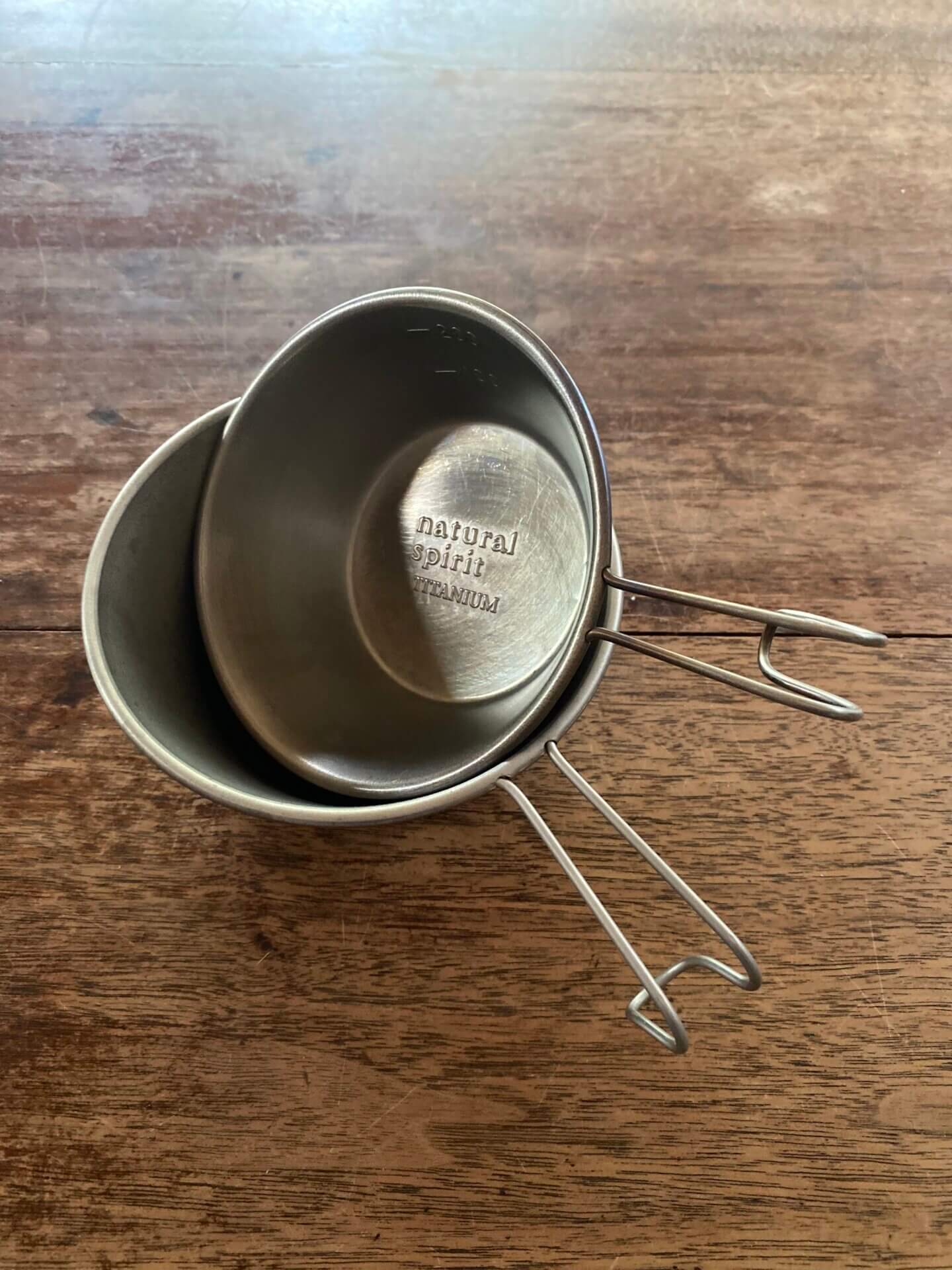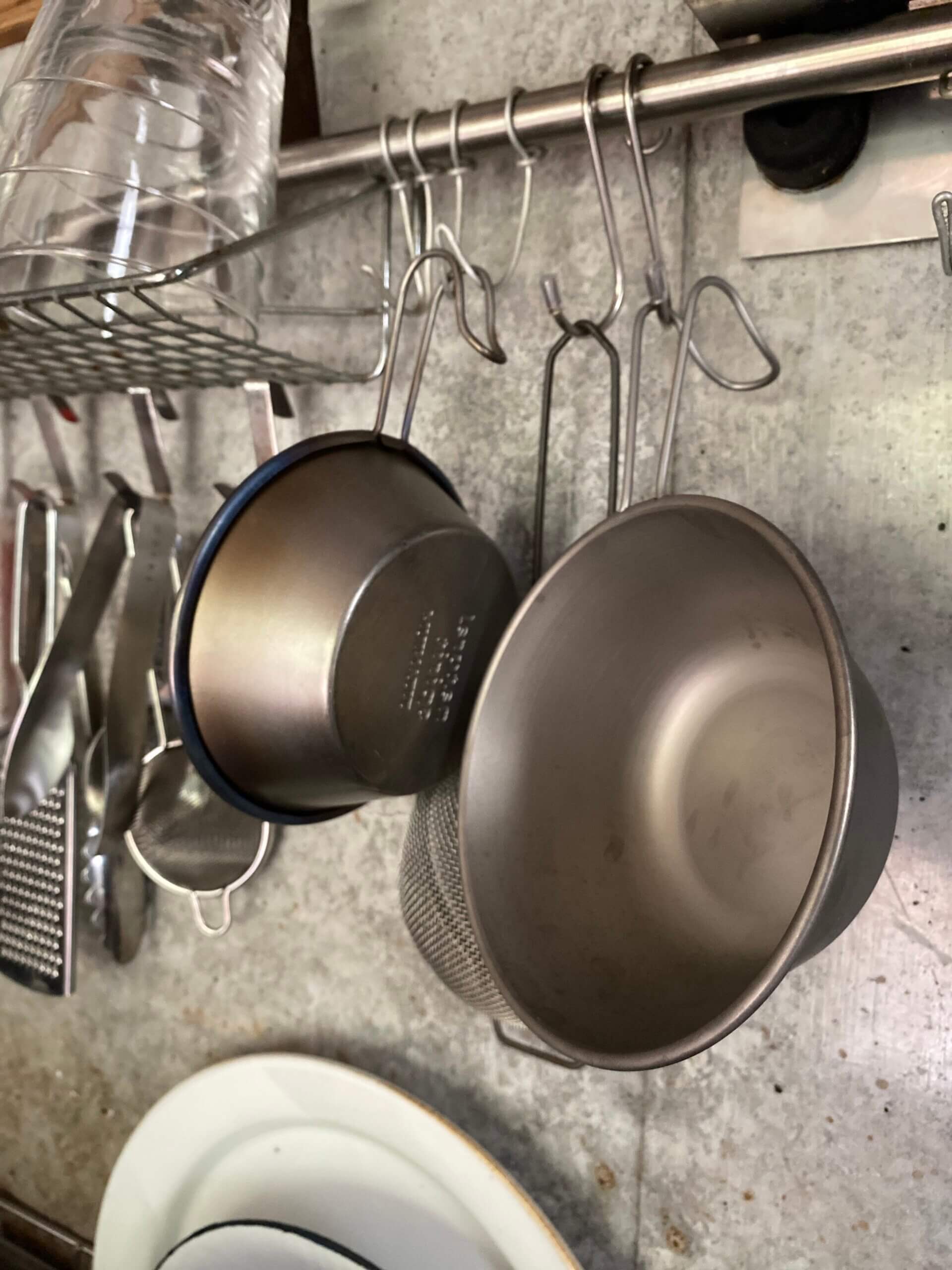 チタンシェラカップ 2026/01/08 道具と家具 アウトドア用の道具を普段キッチンで使っていますチタンのシェラカップは30年愛用我が家のフックスタイルの収納にはピッタリな形使いながら愛でるそれに耐えられるタフで素な形こーゆーものが好きです