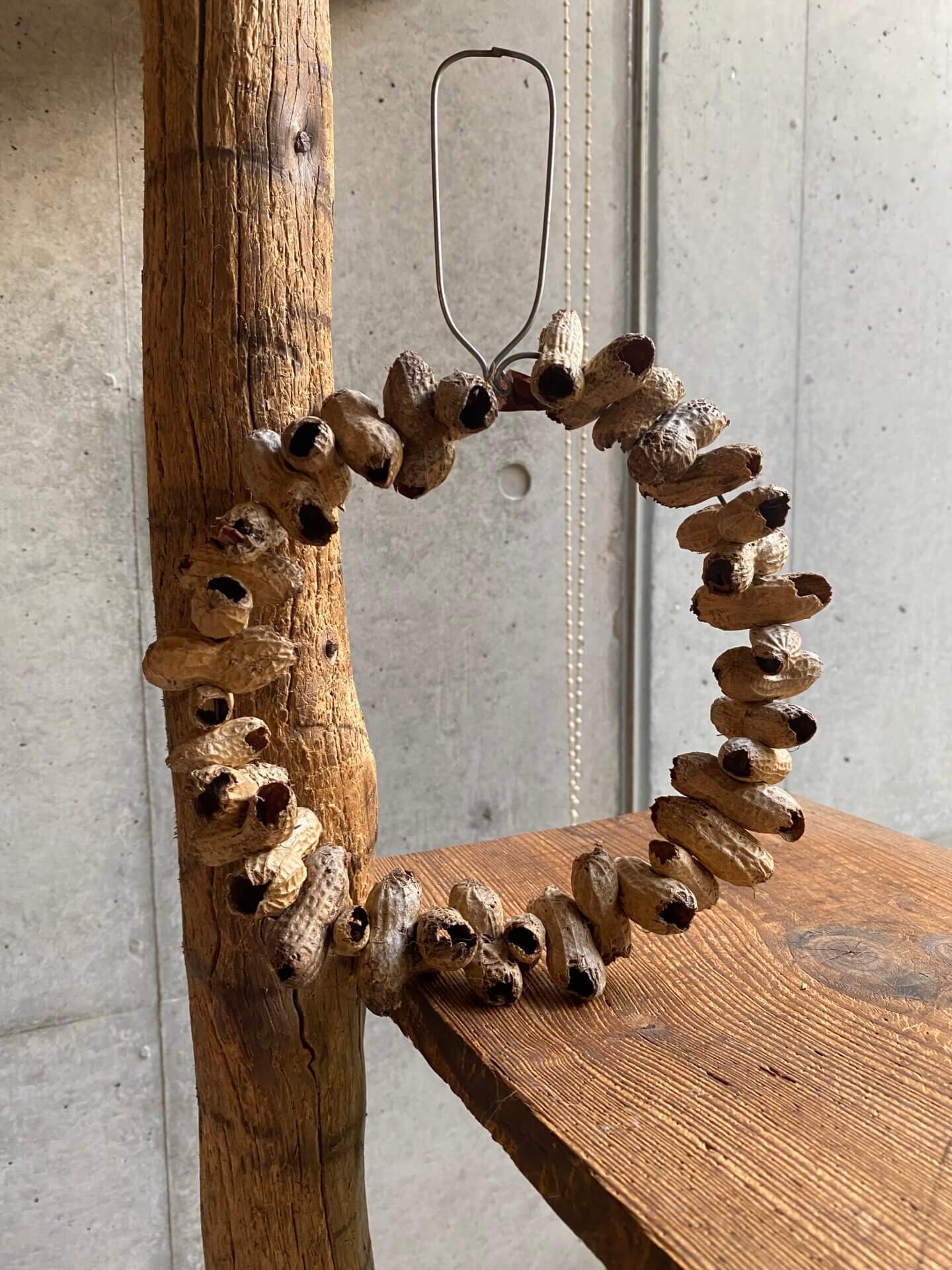 ピーナッツは針金に通したり、最近ではポップコーンを食べた後の針金を利用しています