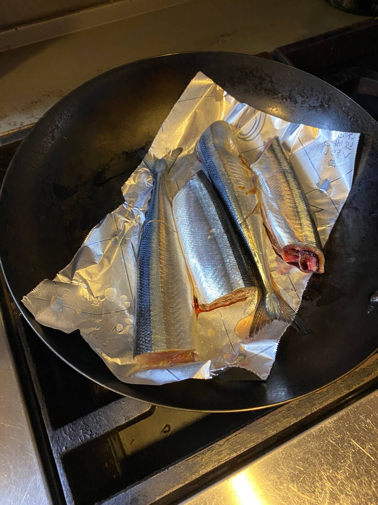 フライパンに焦げつき防止のホイルを敷いて焼きます